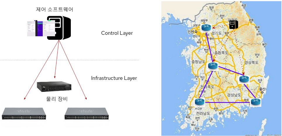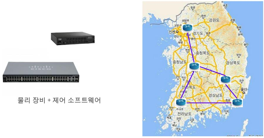 예전에는 물리적으로 멀리 떨어져 있는 네트워크 장비끼리 통신을 하기 위해서 네트워크 회사에서 만든 네트워크 장비들을 사용하였습니다. 네트워크 장비는 네트워크 회사에서 사전에 개발한 네트워크 알고리즘 및 소프트웨어가 함께 탑재되어 있었습니다.