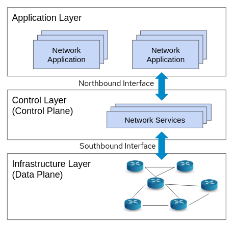 SDN에는 이렇게 네트워크 물리 장비를 의미하는 Infrastructure Layer, 그리고 이런 네트워크 장비의 네트워크 흐름을 제어하는 소프트웨어를 의미하는 Control Layer, 그리고, 실제 네트워크를 사용하는 Application Layer로 구성됩니다.