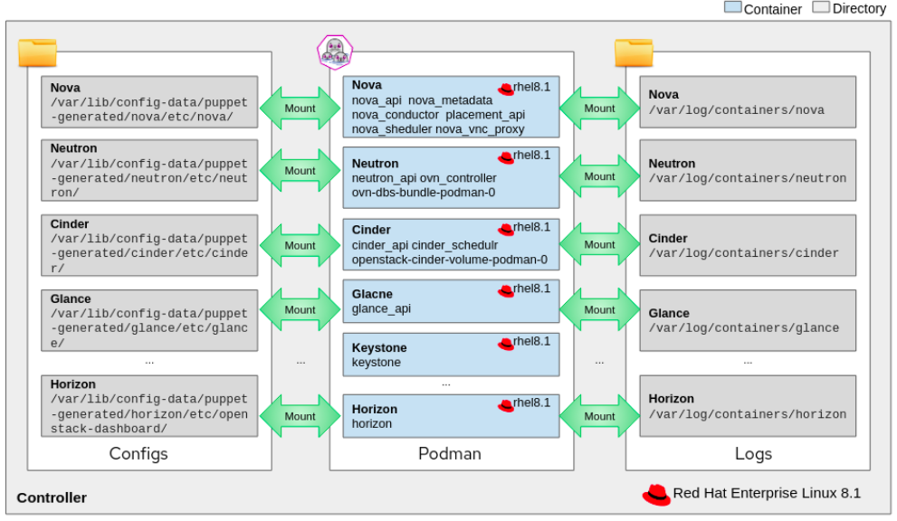 컨테이너화가 되면서 오픈스택 서비스들은 마이크로 서비스화가 되었습니다. 따라서, 각 오픈스택 서비스별로 자원을 함께 공유하기도 하고, 로그 디렉토리 역시 서비스별로 함께 사용을 합니다. 오픈스택의 컨테이너 서비스들은 모든 컨테이너가 호스트 네트워크를 사용하며, 서비스들이 유기적으로 연결되어 있습니다.