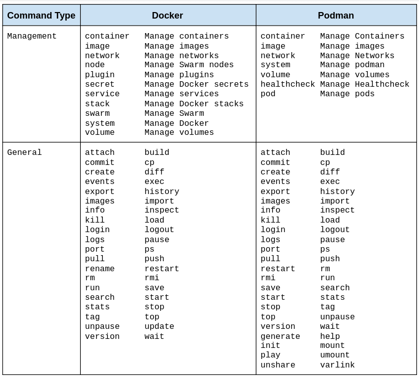 오픈스택 운영에서 중요한 건 Docker와 Podman의 커맨드 사용법일 것입니다. Docker Client의 커맨드와 Podman의 커맨드는 매우 유사합니다. Docker와 Podman 커맨드를 이용하여 컨테이너, 이미지, 네트워크, 볼륨 및 시스템을 관리할 수 있으며, 커맨드 사용법 또한 동일합니다. 대신 Docker 커맨드에는 Podman 커맨드에서 제공하지 않는 6가지 기능이 있으며, Podman 에는 Docker에서 제공하지 않은 2가지 기능이 존재합니다.