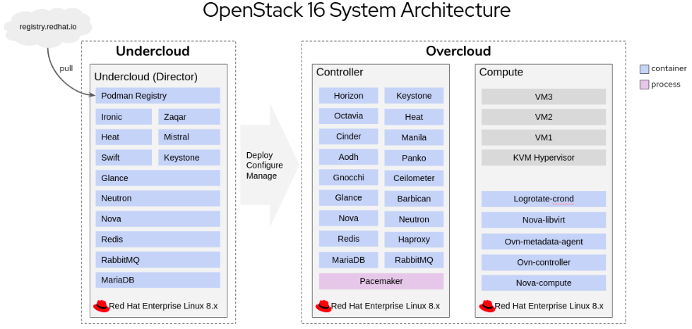 오픈스택 16 버전은 RHEL 8에 설치가 되며, 언더클라우드와 오버클라우드의 오픈스택 서비스가 모두 컨테이너로 실행이 됩니다.