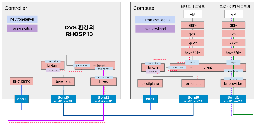 다시 한번 더 정리를 해 보면 OVS 환경의 RHOSP13에서는 다음과 같은 12개 가량의 가상 네트워크를 거쳐 통신이 된다. 그리고, 반드시 컨트롤러 노드를 거쳐야만 한다.
