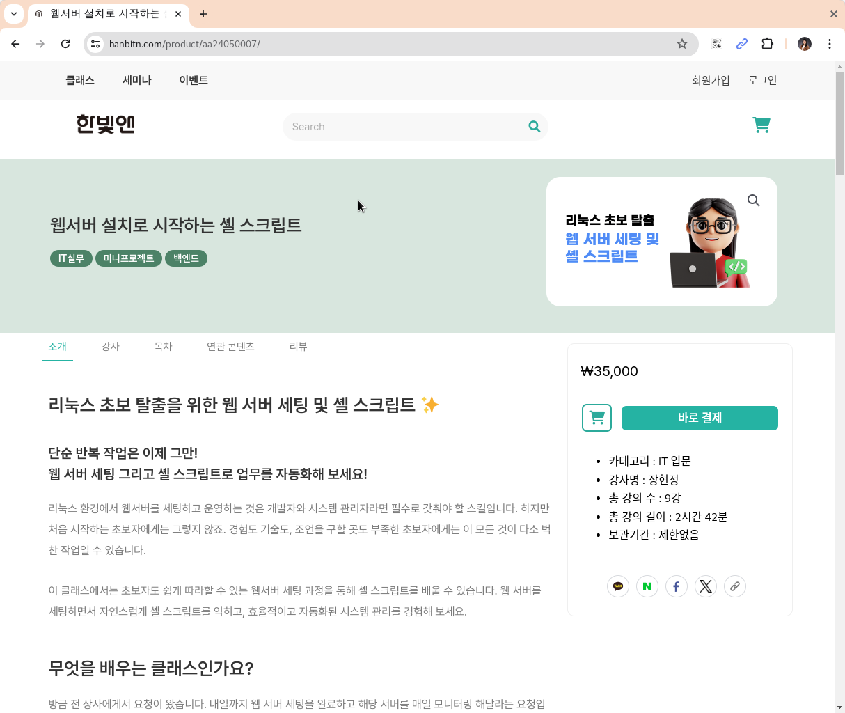 한빛 앤 사이트를 들어가서 보니 제 강의인 셸 스크립트 강의 말고, 좋은 강의들이 많이 있어요. 그것도 매우 착한 가격으로 양질의 강의를 제공을 한다는 거죠~!! 한빛 앤 첫 페이지에 제 강의도 따끈한 신규 클래스로 올라와 있어요. 이 외에도 요즘 트랜드인 AI 관련 강의도 있구요. 근데, 제 강의의 아바타는 꼭 저를 닮은것 같다는 생각이 드네요.